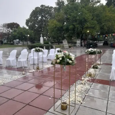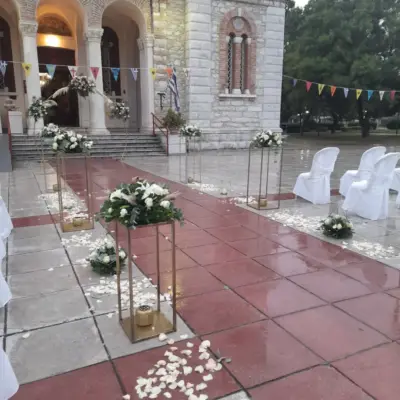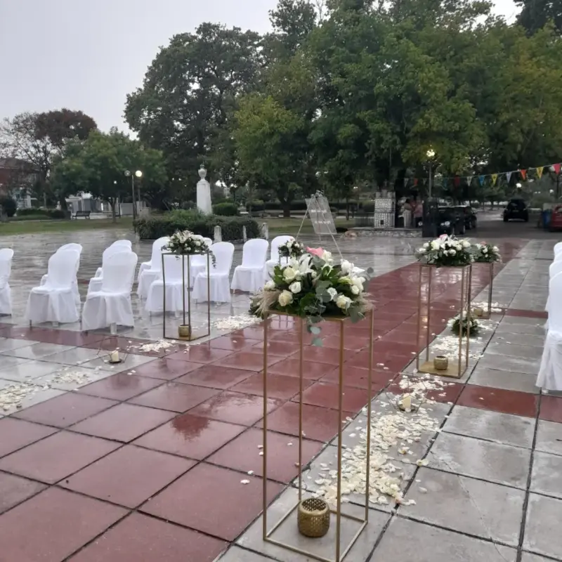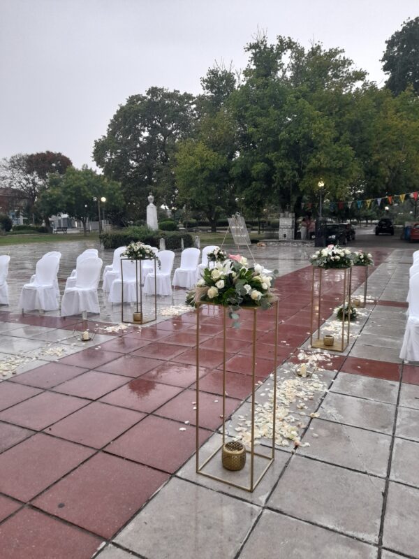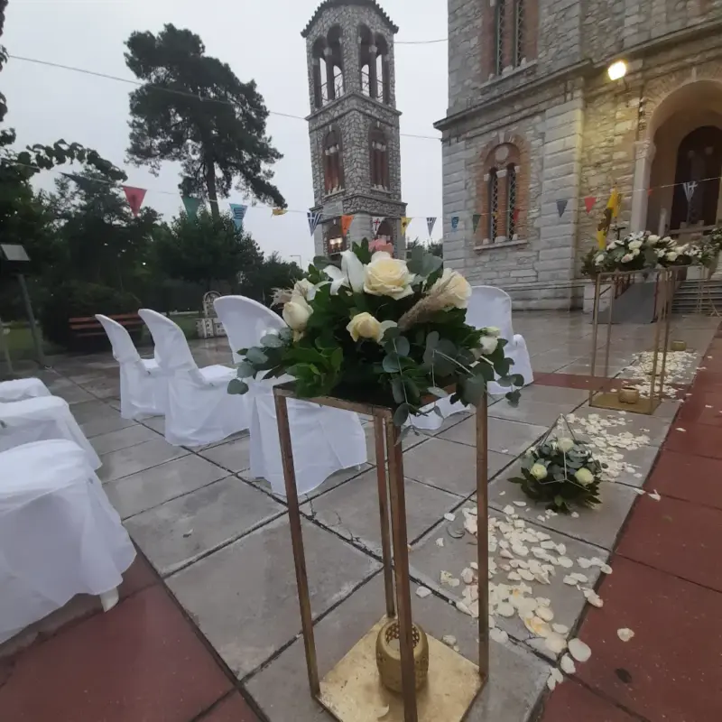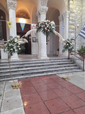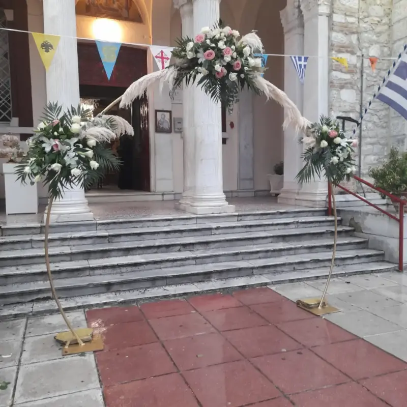 Ένας εντυπωσιακός στολισμός γάμου με χρυσή στρογγυλή αψίδα, διακοσμημένη με φρέσκα λουλούδια και κομψές πρασινάδες. Οι χρυσές βάσεις, οι λευκές και ροζ ανθοσυνθέσεις και οι προσεκτικά επιλεγμένες λεπτομέρειες δημιουργούν ένα ρομαντικό και εκλεπτυσμένο σκηνικό για την τελετή. Αυτός ο στολισμός γάμου συνδυάζει αρμονικά την κομψότητα με τη ζεστασιά, προσφέροντας μια μοναδική ατμόσφαιρα για φωτογραφίες και για κάθε ζευγάρι που αναζητά έμπνευση για τους δικούς του στολισμούς με λουλούδια. Ιδανική επιλογή για ζευγάρια που θέλουν ένα elegant και διαχρονικό αποτέλεσμα στον στολισμό της τελετής ή της δεξίωσης.